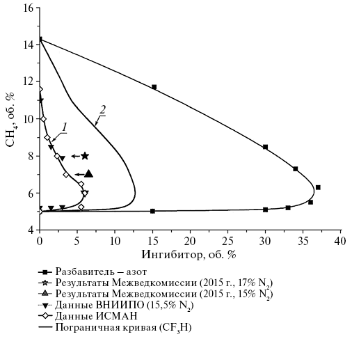 Из уравнения (8) следует, что при разбавлении смеси инертным газом вследствие снижения концентрации окислителя В экспоненциально уменьшается скорость реакции, а значит, и скорость тепловыделения. Таким образом, даже небольшие присадки инертных газов экспоненциально усиливают воздействие ингибиторов. Этот эффект (синергизм инертным газом) использовался для усиленного ингибирования возгораний метано-воздушных смесей. На рисунке 2 приведены результаты испытаний по предотвращению возгораний и взрывов метано-воздушных смесей с использованием (кривая 1) и без использования (кривая 2) синергизма [3]. Для количественного сопоставления итогов всех испытаний на кривой 1 результаты измерений, проведённых в различных организациях, обозначены соответствующими значками. Условия предотвращения возгорания, инициированного локальным источником, не зависят от объёма реактора, поскольку ингибитор предотвращает возгорание в самом очаге инициирования. Этим объясняется количественная согласованность результатов всех испытаний в объё мах различной формы от 0,0032 до 43 м3.