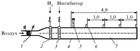 Рис. 3. Схема испытательного стенда прямоточного воздушно-реактивного двигателя 1 – нагреватель воздуха; 2 – смеситель водорода; 3 – смеситель ингибитора; 4 – стабилизатор; 5 – искра; 6 – датчики давления; 7 – реакционная камера. Размеры приведены в метрах