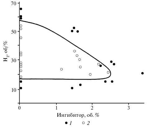 Предотвращение горения ингибированием. Уравнение (8) и выражение (7) хорошо согласуются с экспериментом и показывают: если концентрация ингибитора настолько велика, что величина g больше первой слагаемой в подынтегральном выражении уравнения (8), то подынтегральная функция оказывается отрицательной, значит, прогрессирующий рост скорости процесса и воспламенение становятся невозможными, то есть ингибитор предотвращает возгорание. Это подтверждается экспериментами, всеми испытаниями в больших объёмах, а также на практике. На рисунке 1 показано сильное сужение концентрационной области воспламенения водородо- воздушных смесей под воздействием двух ингибиторов из серии АКМ, состоящих в основном из низших углеводородов [3]. При каждой присадке правее соответствующей предельной кривой воспламенение не происходит. Например, присадки более 1 % АКМ предотвращают горение всех смесей, содержащих более 40 % Н2. Между тем такие же и гораздо большие присадки инертных газов никакого влияния на горение не оказывают. Ключевой реакцией ингибирования в данном случае является Н + С3Н8 = Н2 + С3Н7, в которой носитель цепей – атомарный водород – заменяется радикалом С3Н7, не участвующим в развитии реакционной цепи горения водорода.