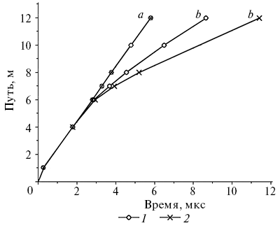 Рис. 6. Диаграммы ударной волны (1) и скачка хемилюминесценции (2) в смеси 33% Н2 с воздухом без пропана (a) и при наличии 3% пропана (b)