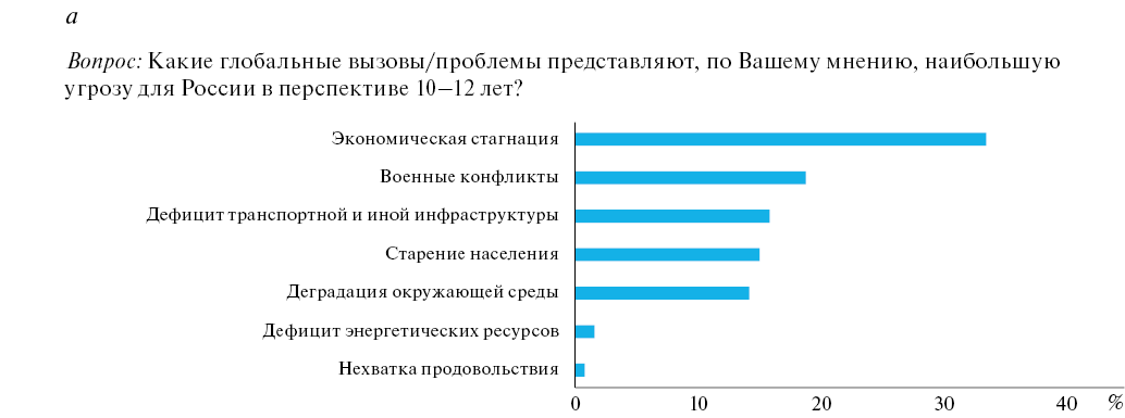 В общественном сознании респондентов низкие темпы роста, близкие к экономической стагнации (хотя вполне приличные по современным стандартам ЕС), однозначно воспринимаются как приоритетный вызов. Второй по значимости считается угроза военных конфликтов. Дефицит транспортной и иной инфраструктуры, старение населения, деградация среды расположились на 3, 4 и 5 местах соответственно. Меньше всего опрошенных беспокоит дефицит энергетических ресурсов и продовольствия.