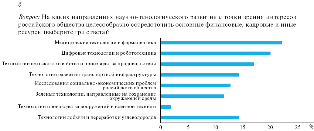 Общественное мнение однозначно указывает на востребованный набор перспективных технологий – медицина, фармацевтика, цифровизация, робототехника, что отражает понимание проб­лемного положения в этих сферах и необходимости его преодоления и достаточно точно совпадает с целями, обозначенными в СНТР. Об этом говорят ответы на вопрос о критически важных технологиях, на которых, по мнению респондентов, стоит сосредоточить основные финансовые, кадровые и другие ресурсы (рис. 1, в).