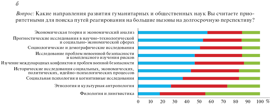 В предложенном для оценки спектре возможных приоритетов научных исследований и, соответственно, приоритетов формирования комплексных планов научных исследований перспективными направлениями в социогуманитарной сфере названы экономические, прогностические, социологические и демографические исследования. Оценки значимости изучения безопасности, истории и этнических конфликтов в контексте указанных вызовов оказались несколько ниже (рис. 2, б).