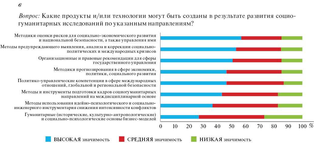 Эксперты в целом поддержали предложенный набор перспективных социогуманитарных технологий: все технологии поддержаны на уровне 80 %, полностью отрицательных оценок нет. В качестве наиболее перспективных экспертами были выделены новые методики оценки рисков и угроз в широком спектре областей (рис. 2, в).