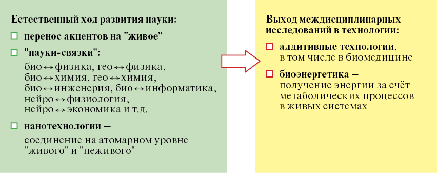 Сегодня уже общепризнано, что таким инструментарием служит конвергенция нано-, био-, информационных, когнитивных и социогуманитарных наук и технологий (НБИКС-технологии), при этом каждая из них выполняет свои функции. Нанотехнологии, оперируя атомами и молекулами, позволяют получить принципиально новые вещества и материалы с заданными свойствами, используя для этого те же технологические приёмы, что и сама природа. Так, на основе аддитивных технологий появляется возможность выращивать изделие, а не получать его путём удаления с заготовки огромного количества лишнего материала, превращающегося в отходы [9, 12]. Симбиоз нано- и биотехнологий позволяет не только воспроизводить живую материю, но и создавать принципиально новые биоорганические материалы и структуры. Такие материалы уже используются, в частности, в медицине. Информационные технологии дают возможность воспроизводить в искусственных объектах природные процессы преобразования информации.