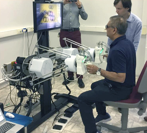 Один из ведущих специалистов в мире по робот-ассистированной хирургии профессор В. Патель проводит манипуляции с помощью российского робота на модели пациента