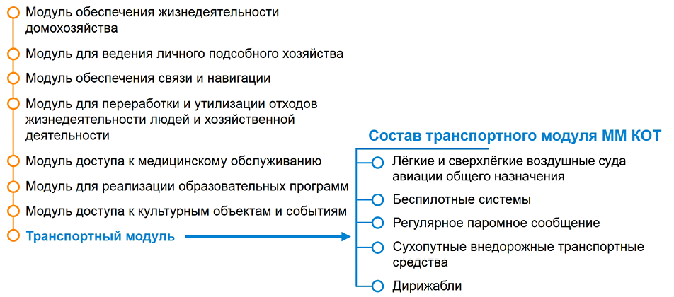 В рамках направления "Умная территория" предложено создание многофункциональных модулей для комплексного освоения территорий. Это позволит в течение короткого срока развернуть небольшой населённый пункт, вмещающий в зависимости от задач от 50 до 1000 человек, и обеспечить в нём весь контур жизнедеятельности. Структура и состав модулей могут быть адаптированы для разных отраслей с учётом специфики территории, например, для освоения минеральных ресурсов или биоресурсов, ведения сельского хозяйства или производства, туризма и отдыха, обороны и безопасности. Актуально создание внедорожного модуля, в котором предполагается задействовать малую и сверхлёгкую авиацию, внедорожники всех видов, амфибии, дирижабли (в первую очередь для доставки крупногабаритных грузов). Необходимо сформировать унифицированную линейку внедорожных транспортных средств, имеющих минимальную стоимость жизненного цикла, пригодных к ремонту в полевых условиях. Также потребуется создание единой цифровой платформы, центров обеспечения мобильности, которые организуют максимально эффективное взаимодействие транспортных предприятий, частных перевозчиков и индивидуальных владельцев транспортных средств. В этом случае станет возможен переход от оказания унифицированных транспортных услуг к концепции "Mобильность как услуга", ближайший аналог которой – уже привычный в больших городах "каршеринг". Структура многофункционального модуля представлена на рисунке 2.