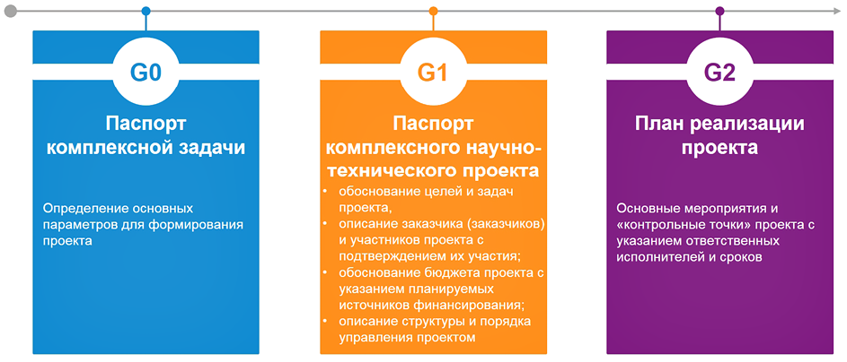 Все проекты, предложенные для включения в Программу, должны пройти экспертизу по критерию наличия реалистичных, обоснованных и потенциально решаемых в ближайшие 3–15 лет научно-технических задач, научно-технического задела и предполагаемых исполнителей проекта, а также заказчика и индустриальных партнёров. Применение "гейтового подхода" при формировании Программы (рис. 3) реализует заложенный в Стратегии научно-технологического развития принцип полного инновационного цикла, позволяющий выявлять и устранять разрывы в инновационных цепочках, доводя результаты исследований и разработок до стадии практического применения и удовлетворяя спрос хозяйствующих субъектов на инновационные научно-технические решения.
