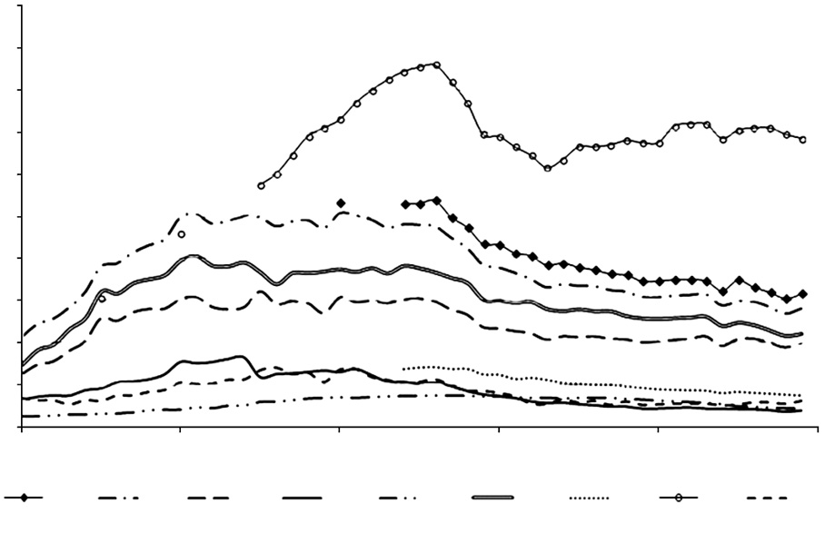 Неоднородными бывают и данные водохозяйственной статистики. В конце 1980-х годов были пересмотрены стандарты отнесения тех или иных видов сточных вод к отдельным категориям загрязнённости, в том числе части нормативно очищенных и нормативно чистых вод к категории загрязнённых. Если не учитывать это обстоятельство, можно прийти к парадоксальным выводам. Так, М. Я. Лемешев [5] привёл следующую динамику загрязнённых сточных вод СССР: 1985 г. – 16 км3, 1988 г. – 29 км3, что означает огромное увеличение, на 80 %, всего за 3 года. Аналогичная ситуация сложилась и с загрязнёнными сточными водами России: 1985 г. – 12 км3, 1990 г. – 27,8 км3 [6]. В связи с этим объективный анализ можно провести, лишь разбив весь ряд данных на два периода – до и после 1986 г. Менялись и интегральные показатели качества вод: на смену индексу загрязнённости воды (ИЗВ) пришёл удельный комбинаторный индекс загрязнённости воды (УКИЗВ), но оба основаны на определении содержания загрязняющих веществ по отношению к их предельно допустимой концентрации (ПДК). Заметим, что большинство разработанных ПДК далеки от совершенства ввиду их недостаточной экологичности. Всё это способствует расхождениям в оценке антропогенных изменений стока и остроты гидроэкологической ситуации, заставляет прибегать к помощи косвенных показателей, например, для оценки качества вод – к кратности разбавления сточных вод, особенно загрязнённых.