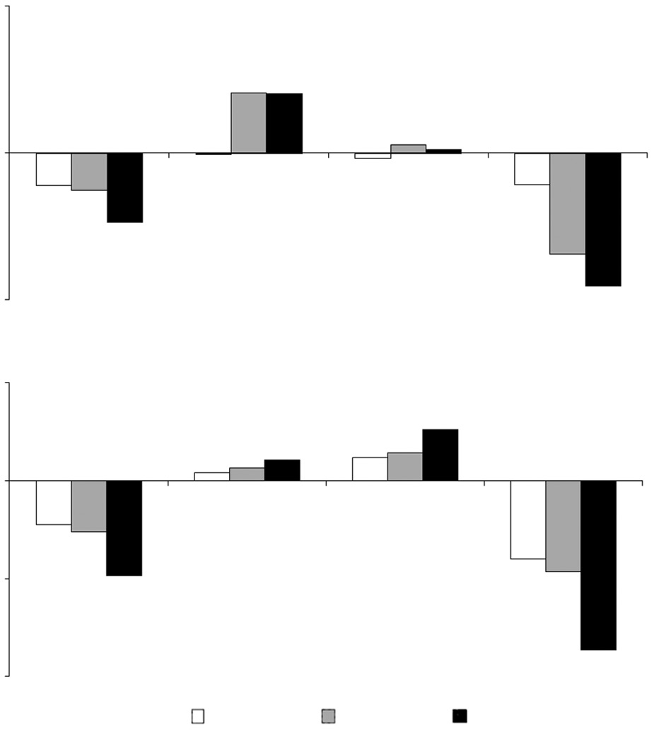 Рис. 2. Климатические и антропогенные изменения стока Волги у Волгограда (а) и Дона у Раздорской (б) за 1930–2006 гг. по сравнению с 1891–1929 гг. 1 – климатические изменения; 2 – антропогенные изменения; 3 – суммарные изменения; I – годовые изменения; II – зима; III – лето–осень; IV – половодье