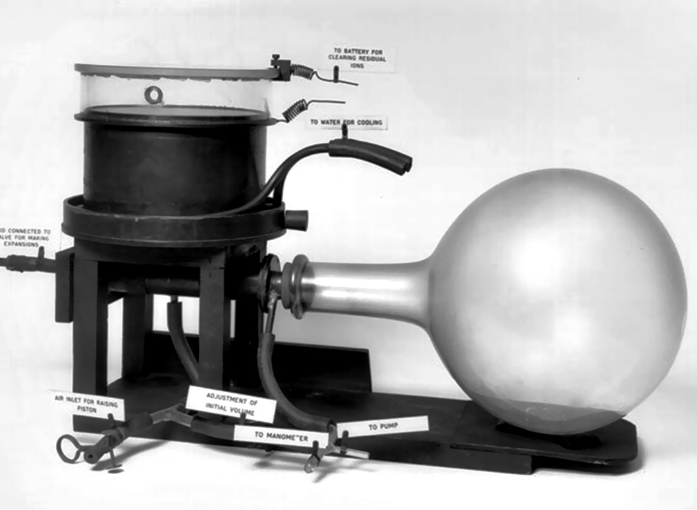 В один из дней 1894 г. Вильсон наблюдал корону при освещении облака солнцем: "Это вызвало во мне интерес и желание воспроизвести такой же эффект в лаборатории. <…> В начале 1895 года я проделал несколько опытов по экспериментальной имитации процесса создания облаков при расширении влажного воздуха. Почти сразу же я обнаружил нечто, обещавшее быть более интересным, чем те оптические явления, которые я до этого собирался исследовать" [1, с. 447]. Он заметил, что во влажном, очищенном от пыли воздухе часто образуются капельки. Вильсон предположил, что конденсация происходит, вероятнее всего, на ионах. Познакомившись в 1896 г. с незадолго до этого открытыми В. Рентгеном X-лучами, он использовал рентгеновскую трубку для электризации воздуха в специально построенной камере. Образующийся при этом плотный туман подтверждал его гипотезу о природе конденсации. В процессе работы он заметно улучшил конструкцию прибора, ставшего известным как конденсационная (ионизационная) камера.