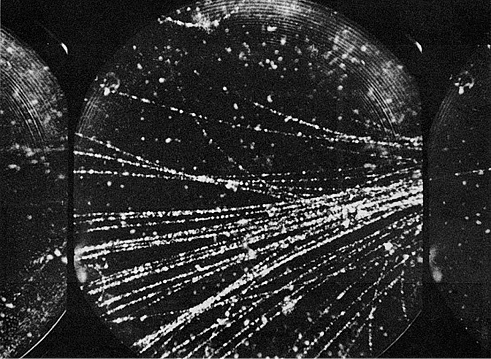 Что к тому времени представляла собой его ионизационная камера? По конструкции это цилиндр, заполненный парами спирта и воды. В камере присутствует поршень, и при его быстром опускании температура падает вследствие адиабатического расширения, пары приобретают способность легко конденсироваться. Влетающие через отверстие в камере частицы вызывают ионизацию молекул среды и появление туманного следа – трека. Частицы разного размера, с разными зарядами и энергией порождают разные треки. Так, трек электрона выглядит тоньше и прерывистей, чем трек массивной альфа-частицы.