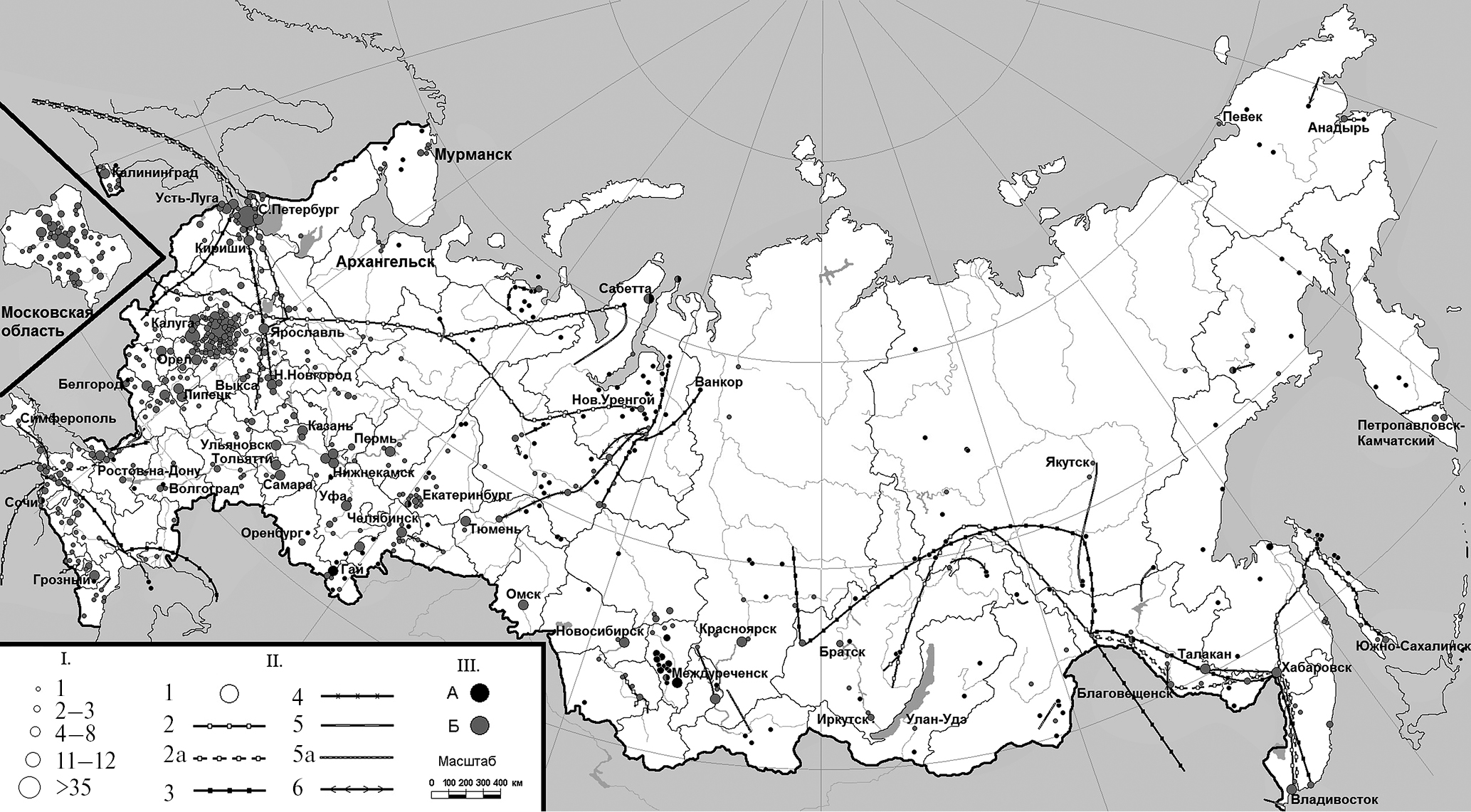 Рис. 1. Объекты нового промышленного и транспортного строительства на территории России I – количество объектов; II – объекты: 1 – промышленное предприятие, 2 – газопровод, 2а – газопровод строящийся, 3 – нефтепровод, 4 – нефтепродуктопровод, 5 – железная дорога, 5а – железная дорога строящаяся, 6 – ЛЭП; III: А – добывающая промышленность, Б – обрабатывающая промышленность, порты и терминалы. Картограф – А.Н. Васильцова
