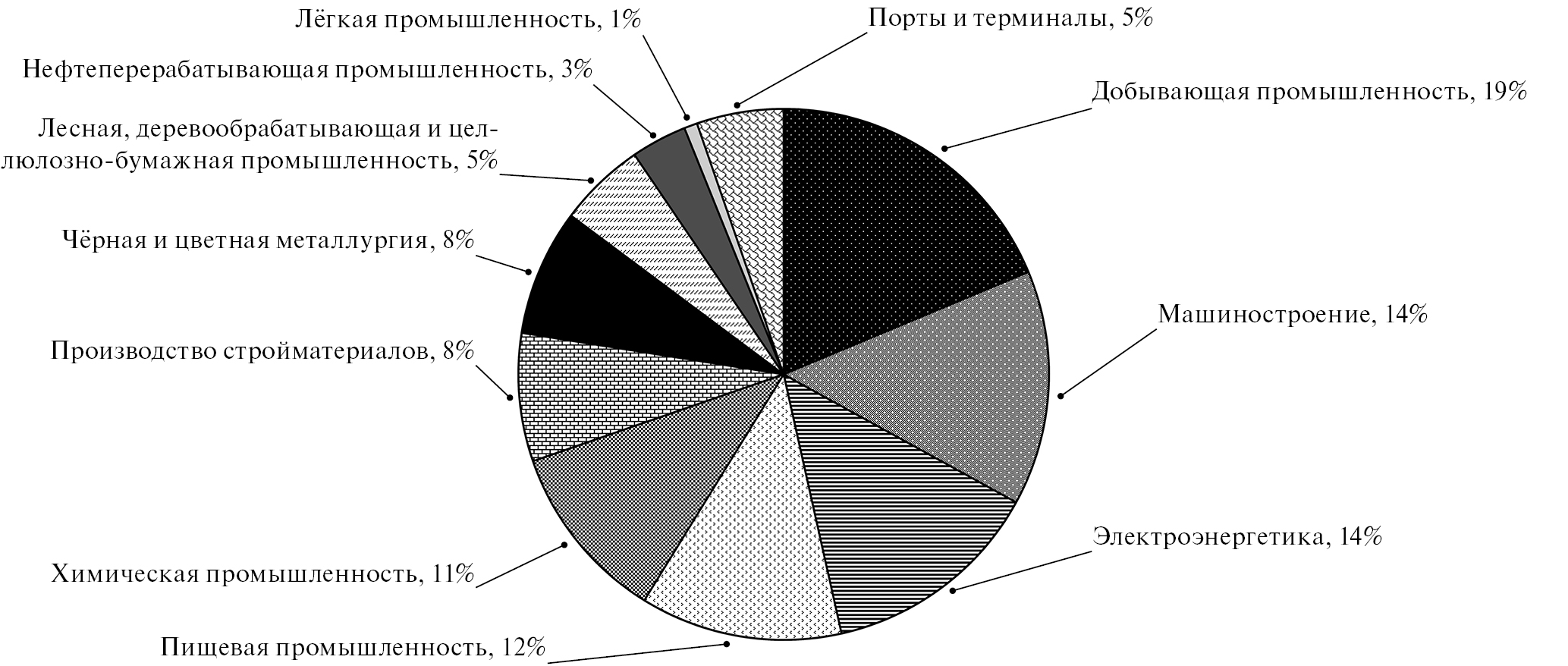 В структуре нового промышленного строительства преобладают базовые, экологически агрессивные отрасли – добывающая, электроэнергетика, химическая промышленность, металлургия, нефтепереработка, составляющие в совокупности почти 2/3 новых объектов. Невелика доля машиностроения, почти незаметна – лёгкой промышленности (рис. 2). Можно констатировать отсутствие признаков экологизации, "озеленения" промышленной структуры. В перечне объектов постсоветского строительства мало высокотехнологичной промышленности: аэрокосмической, фармацевтической, станкостроения, электроники, производства высокоточной аппаратуры, информационного и коммуникационного оборудования.