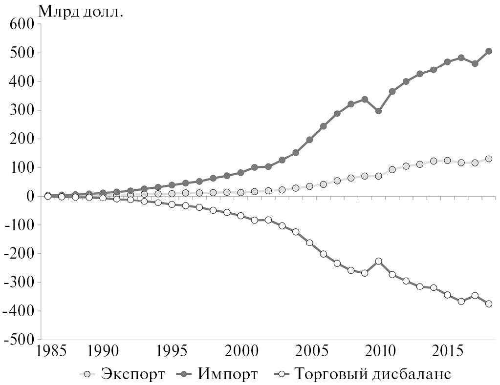 Крупнейший торговый партнёр США Китай в 2017 г. экспортировал товаров на сумму 505,5 млрд долл. при объёме импорта в 129,9 млрд. Таким образом, торговый дефицит США с Китаем составил 375,6 млрд долл., то есть около 44 % от общего отрицательного торгового баланса США, причём год от года он только увеличивается (рис. 2). Такая же ситуация, но в меньшем масштабе характерна для других торговых партнёров США – Мексики, Японии, Германии2. Решение проблемы в краткосрочной перспективе администрация Д. Трампа видит во введении таможенных барьеров – установлении импортных пошлин, технологических требований и т. д.