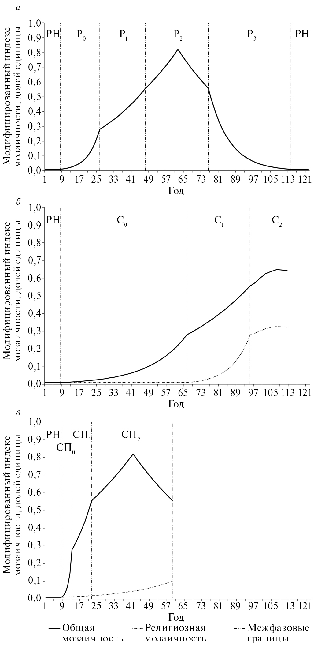 Изменение значений модифицированного индекса мозаичности в процессе прохождения конфессиональным пространством "усреднённых" циклов религиозной конкуренции – Р-цикла (a), С-цикла (б) и СП-цикла (в). Каждый из циклов, следующих за этапом религиозного насыщения (РН), состоит из четырёх фаз, обозначаемых соответствующим нижним индексом: 0 – начального замещения, 1 – устойчивого замещения, 2 – паритета, 3 – окончательного замещения; линия графика общей мозаичности отражает структуру пула конкурентных "игроков" с учётом как религий, так и секулярных идеологий; графика религиозной мозаичности – только религий