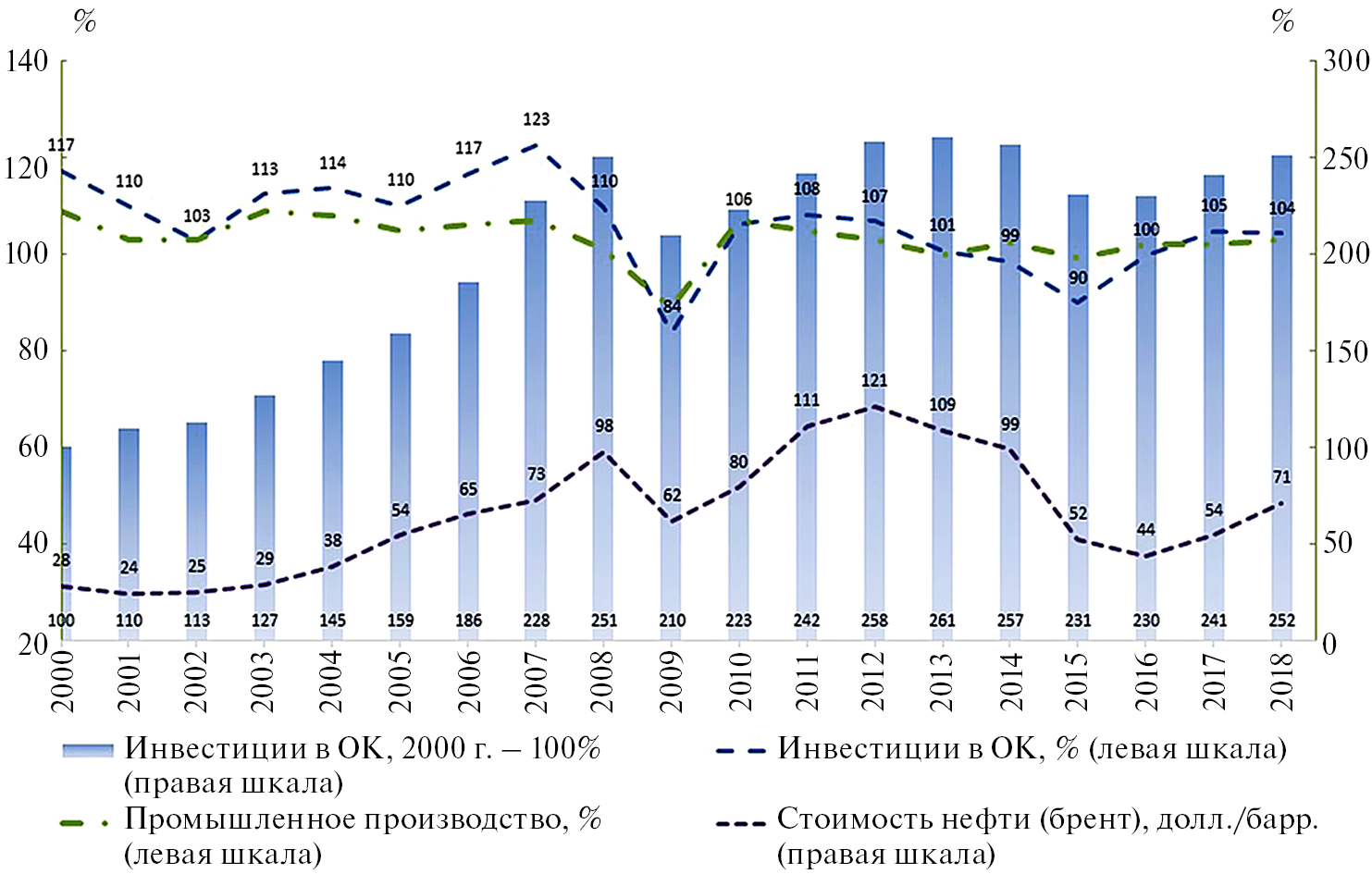 Динамика инвестиций в основной капитал. Современная российская инвестиционная политика недалеко ушла от принципа, сформулированного Гёте ещё в XVIII в.: "Большой и малый свет вам изучать придётся. / А там – пускай всё остаётся, Как бог пошлёт" [1]. На рисунке 1 хорошо видно, что темпы роста вложений в основной капитал (ОК) тесно связаны с темпами роста стоимости нефти на мировых рынках (коэффициент корреляции 0,7). В период быстрого повышения нефтяных цен инвестиции в ОК росли в России невиданными по нынешним меркам темпами, достигнув в 2007 г. 123 %. Оборотная сторона этой модели: перестали увеличиваться цены на нефть – закончился и ускоренный рост инвестиций. При этом в 2014–2015 гг. они сокращались в абсолютном выражении, а в 2016 г. остановились на провальном уровне 2015 г. В итоге (с учётом данных за первое полугодие 2018 г.) сегодня в российскую экономику вкладывается примерно столько же средств, сколько в кризисном 2008 г., и меньше, чем в 2012–2014 гг.