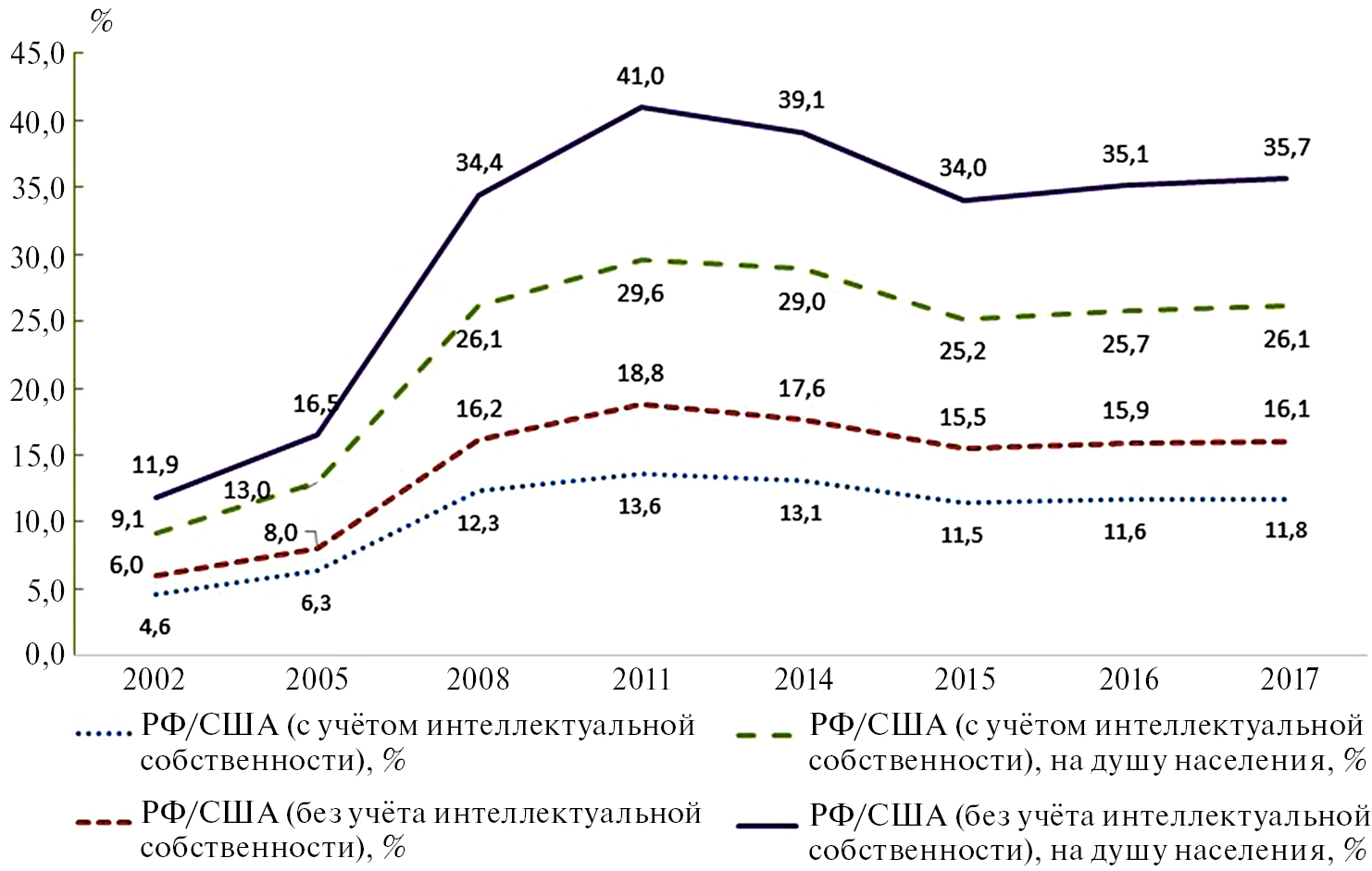 Росстат систематически представляет данные по ППС для ВВП в целом. По отдельным категориям товаров, в частности инвестиционным, информация по ППС эпизодична. Имеются данные за 2002, 2005, 2011, 2014 гг. Информации за последующие годы нет. При этом именно в 2015–2017 гг. российская экономика была вынуждена адаптироваться к принципиально новым условиям функционирования – низким ценам на нефть и последовательному ужесточению политических и экономических санкций. Дать оценку ППС по инвестициям за эти годы без полноценных статистических сопоставлений невозможно, но высказать некоторые обоснованные предположения всё же реально. Действительно, как бы ни менялся номинальный курс рубля к доллару, соотношение ППС по ВВП и ППС для инвестиций на протяжении последних 10 лет довольно устойчиво. Предположим, что в 2015–2017 гг. отношение ППС для ВВП и ППС для инвестиций 2014 г. (последний год, за который есть официальные данные) не изменилось. Тогда ППС для инвестиций в 2015 г. равняется 33,02 руб./долл., 2016 г. – 33,94 руб./долл., 2017 г. – 34,58 руб./долл. В расчётах будем опираться на эти значения. Конечно, учтём и то, что население США в 2,2 раза превышает российское, этот фактор автоматически предопределяет различие в валовых значениях. Поэтому рассмотрим как валовые, так и относительные (на душу населения) показатели.