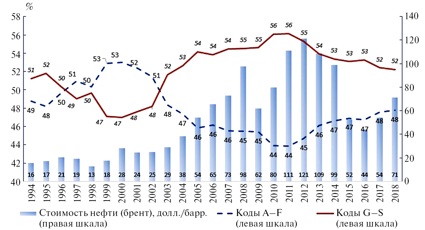 Мы отмечали инвестиционный рывок российской экономики в начале 2000-х годов. Более пристальный анализ качества этого роста в очередной раз подтверждает известную истину: видимая часть явления редко отражает его сущность. Действительно, для решения стратегических задач развития страны важен не только рост инвестиций, но и его качество. Темпы роста инвестиций в отечественную экономику были весьма высоки до 2008 г. (см. рис. 1). Но если до 2001 г. этот рост обеспечивался преимущественно за счёт инвестиций в материальное производство (разделы A–F), то с 2002 г. вплоть до 2011 г. – уже за счёт услуг (разделы G–O) (рис. 3). Невозможно не заметить и связь между характером инвестиционного роста и динамикой нефтяных цен: чем дороже нефть, тем относительно меньше инвестиций направляется в материальное производство и, соответственно, больше в услуги, и наоборот.