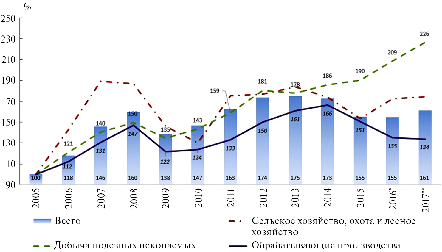 Рис. 4. Динамика инвестиций в основной капитал в РФ по видам экономической деятельности (за 100 % взяты значения 2005 г.) * Данные уточнены на основании годовых отчётов и окончательных расчётов объёма инвестиций, не наблюдаемых прямыми статистическими методами. ** Данные приведены в соответствии с Общероссийским классификатором видов экономической деятельности ОКВЭД2.