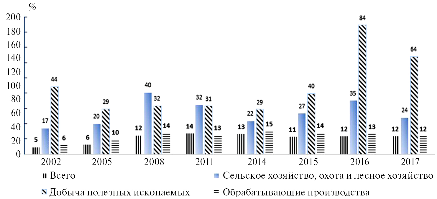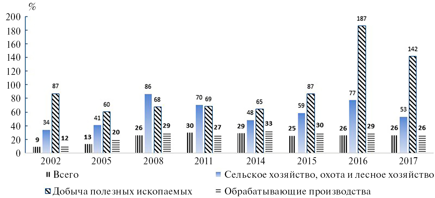 И да, и нет. Действительно, темпы роста инвестиций в добывающие производства всегда оказывались выше, чем в обрабатывающие. Но до 2008 г. они были сопоставимы. С 2009 г. обрабатывающие производства стали отставать, а с 2015 г. инвестиционные траектории добывающих и обрабатывающих производств разошлись: инвестиции в добывающие отрасли продолжали расти, а в обрабатывающие начали резко (по 10 п.п. в год) снижаться. Инвестиции в сельское хозяйство осуществлялись хорошим, хотя и разным темпом. Лишь с 2014 г. они стали явно отставать от темпов роста инвестиций в добывающие производства (рис. 4).
