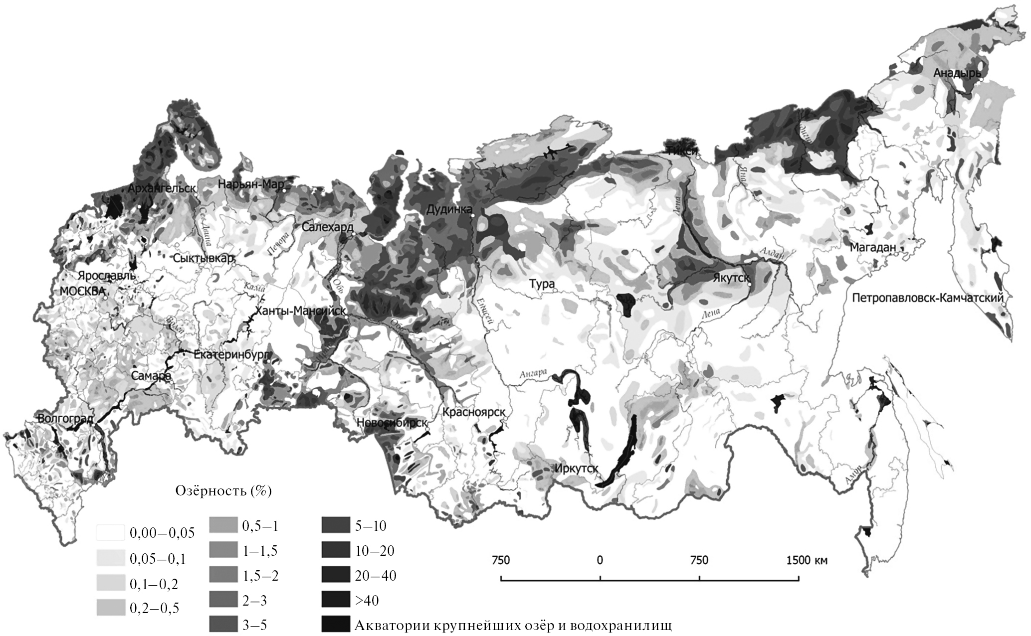 При огромном количестве водоёмов, расположенных на прибрежных равнинах морей Северного Ледовитого океана, а также разбросанных по всей территории Западно-Сибирской низменности, значительные пространства российской Азии почти лишены озёр. На рисунке 1 представлена карта озёрности России, построенная по итогам новой оценки её озёрных водных ресурсов.