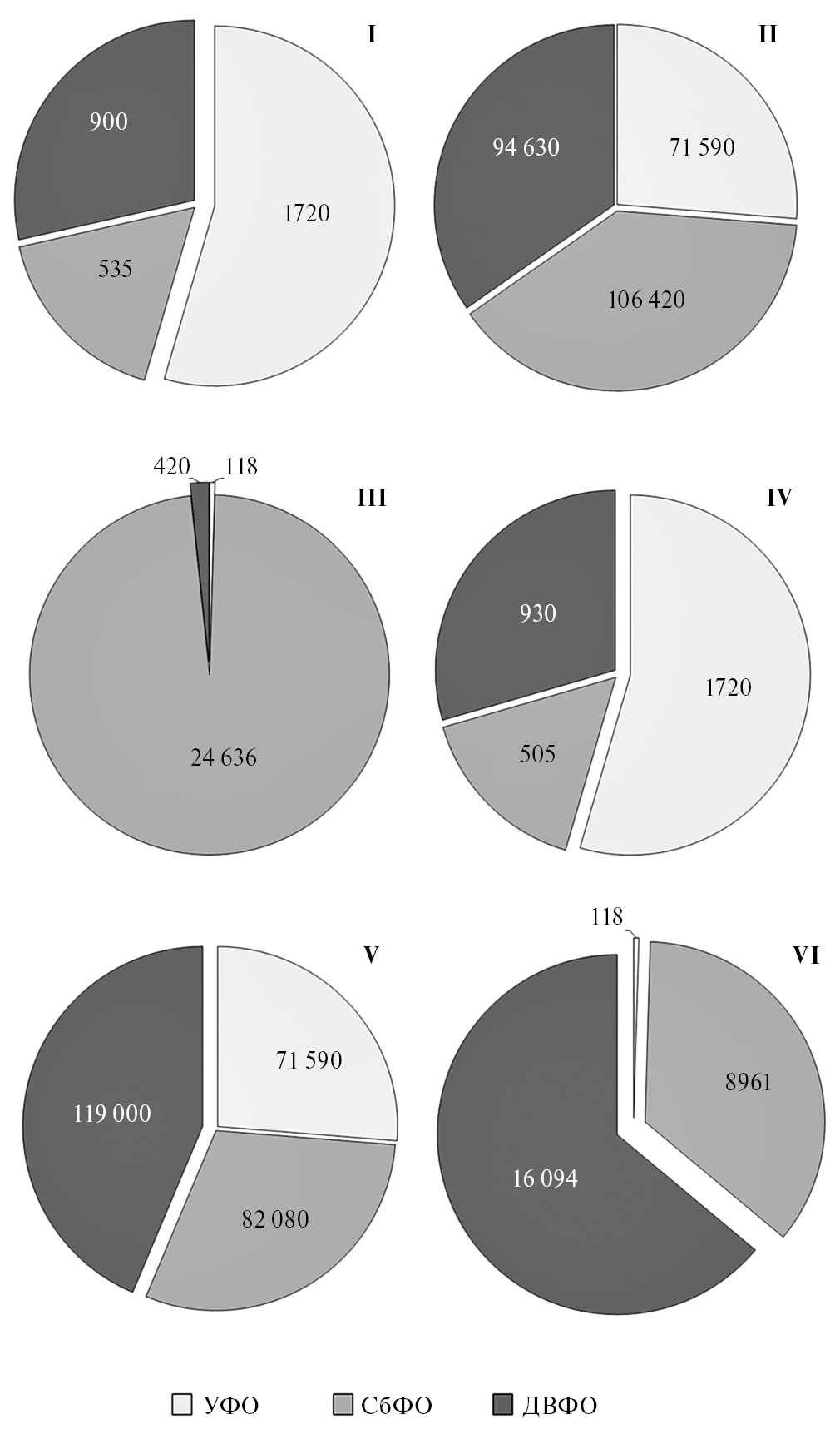 Рис. 2. Озёрный фонд АЧР Распределение озёр (в тыс.) по федеральным округам АЧР в старых (I) и новых (IV) границах; суммарная площадь водной поверхности (в км2) в старых (II) и новых (V) границах округов; суммарные объёмы воды (в км3), содержащейся в водоёмах, с учётом старых (III) и новых (VI) границ округов