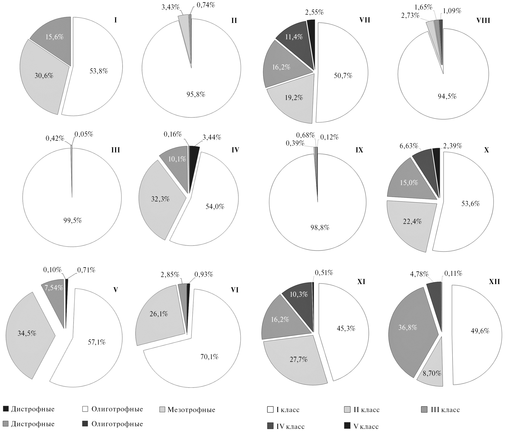 Рис. 3. Оценка объёмов вод различного качества, содержащихся в водоёмах АЧР Трофический статус вод, заключённых в водоёмах (I–VI) площадью >100 км2: I – УФО, II – СФО, III – ДВФО; во все водоёмы (исключая озеро Байкал): IV – УФО, V – СФО, VI – ДВФО; класс загрязнения вод, заключённых в водоёмах АЧР (VII–XII): VII– УФО, VIII – СФО, IX – ДВФО; во всех водоёмах (исключая озеро Байкал): X – УФО, XI – СФО, XII – ДВФО