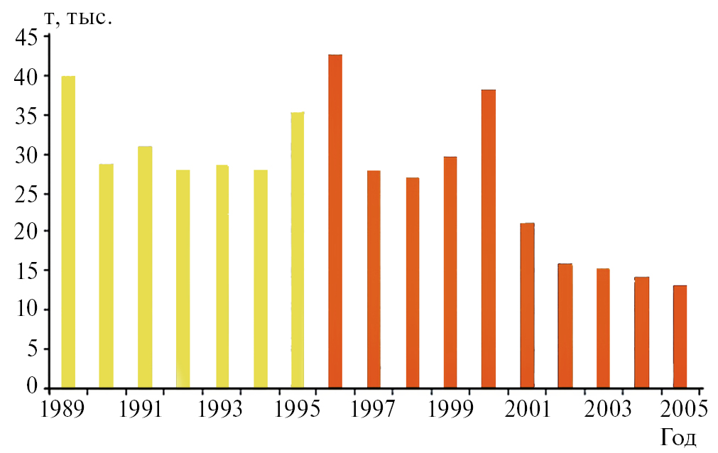 1990-е годы оказались самыми тяжёлыми в современной истории российского рыболовства в Чёрном море. Резкое ухудшение экологической ситуации в водоёме и развал СССР вызвали катастрофическое снижение суммарного российского вылова рыбы – до 92 (1990), 32,8 (1991) и 9 (1994) тыс. т в год, то есть в 2–3 раза ниже уровня начала ХХ в. [16]. Даже если учесть тот факт, что в 1980-х годах на долю РСФСР приходилось не менее 50% общего улова в СССР в Чёрном море, разница в добыче колоссальна – от 5 до 24 раз в пользу рыбодобычи докризисного времени (см. рис. 1).