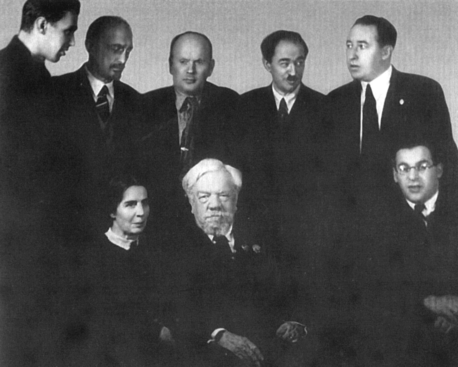 Академик С.А. Чаплыгин со своими учениками – сотрудниками ЦАГИ. Слева направо сидят: Н.М. Семёнова, С. А. Чаплыгин, Г.Н. Абрамович; стоят: Г.И. Петров, В.В. Голубев, И.П. Горский, К.А. Ушаков, А.Г. Бычков. 1939 г.