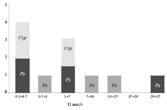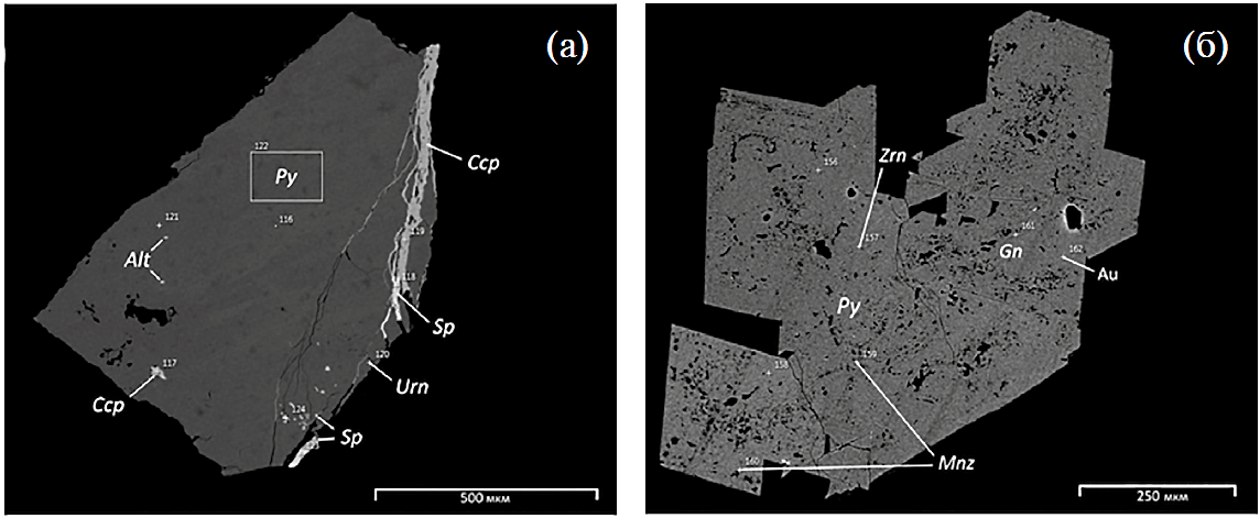 В основном минералы U и Th в колчеданных рудах представлены уранинитом (UO2) (Мурзин и др., 2011; Garuti, Zaccarini, 2005), реже – браннеритом (UTi2O6), недавно обнаруженном на месторождении Тарньер (Молошаг, 2015). Последнее метаморфизовано в амфиболитовой фации (Vikentyev et al., 2017) в условиях, отвечающих пирротиновой фации метаморфического преобразования сульфидных руд (Молошаг и др., 2004). При этом повышенные концентрации иттрия (1.8–3.3 мас.% Y2O3) и тория (1.3–18.3 мас.% ThO2) в браннерите отвечают его высокотемпературной разновидности (Мигута, 1997).