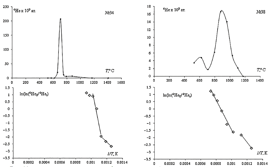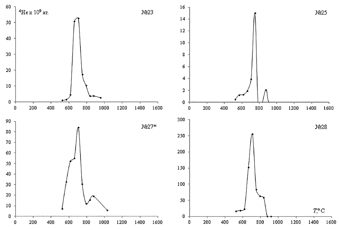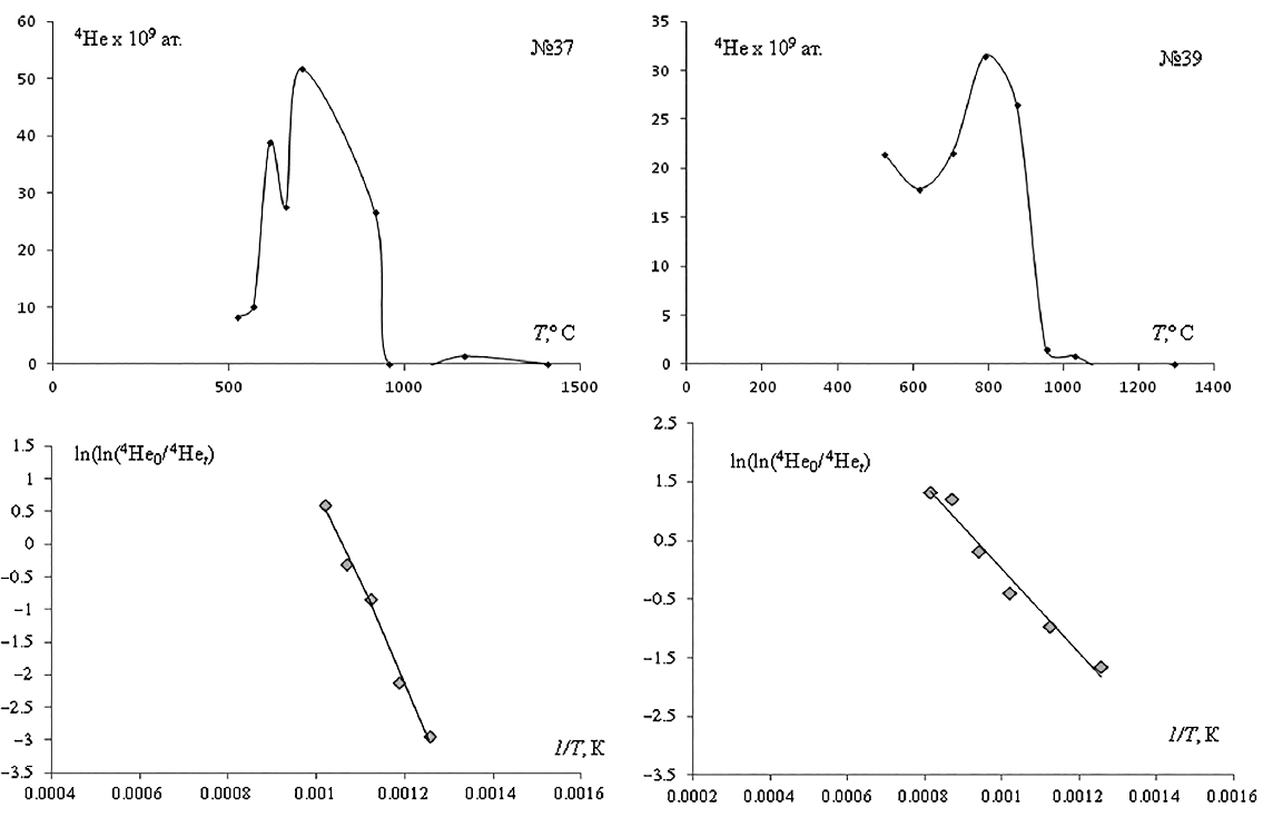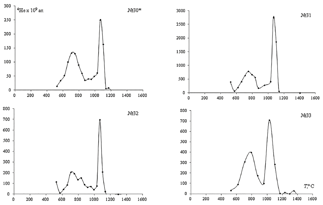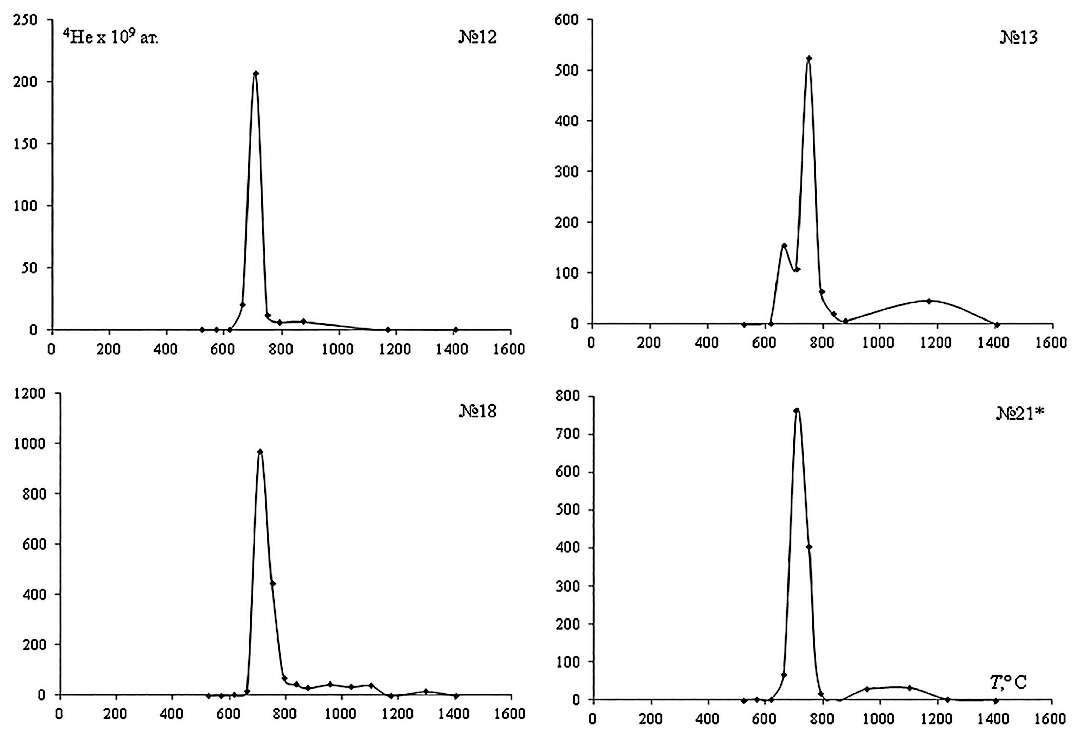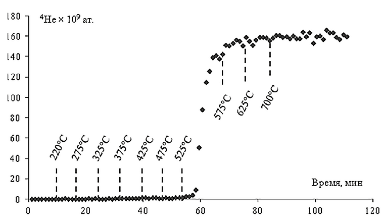 Методика определения миграционных параметров. Кинетика выделения гелия из сульфидов была изучена методом ступенчатого отжига на масс-спектрометрическом комплексе МСУ-Г-01 (ИГГД РАН) по методике (Якубович и др., 2010) из навесок около 1 мг. Часть образцов предварительно промывали в слабых кислотах (1N HCl, 2N H2SO4) для удаления поверхностных загрязнений. Нагрев образца проводился в экстракторе, нагреватель которого представляет собой тонкостенный цилиндр из рения, пережатый в средней части и обеспечивающий нагрев до 1400оС. Градуировка нагревателя осуществлялась с помощью оптического пирометра ПРОМИНЬ-М. Образец помещали в камеру масс-спектрометра, где его нагревали до определенной температуры и далее измеряли количество выделившегося при этой температуре 4Не. При этом газ не скачивался, и осуществлялось дальнейшее повышение температуры. Время отжига на каждой ступени оставалось постоянным в ходе одного эксперимента и составляло 210 с.