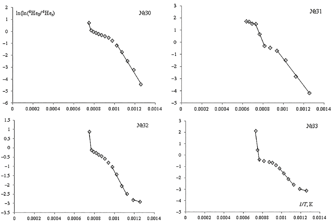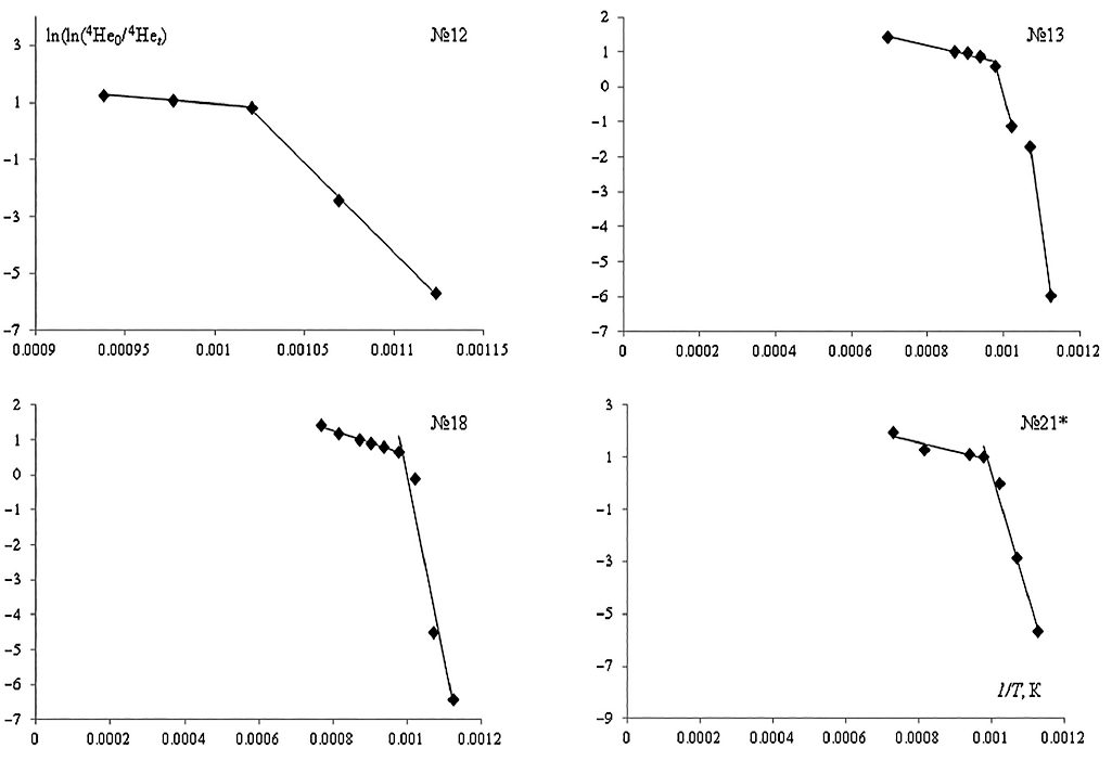 В общей сложности изучена кинетика выделения радиогенного гелия и рассчитаны миграционные параметры для 39 образцов сульфидов и сульфосолей из 15 месторождений (табл. 2). Экспериментальные данные ступенчатого отжига сульфидов и сульфосолей приведены в приложении (www.ipgg.ru).