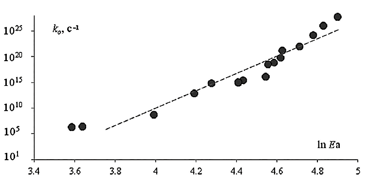 где k0 – частотный фактор, E – энергия активации миграции, R – газовая постоянная, Т – абсолютная температура, He – количество атомов гелия в системе, t – время.