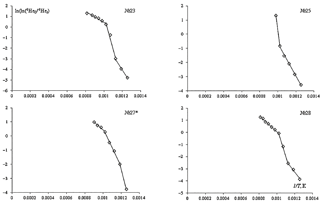 где Не0 – суммарное количество атомов гелия, находящегося в одном энергетическом положении, Неt – количество оставшегося к этому моменту времени атомов гелия в данном энергетическом положении, t – время отжига на каждой ступени. Это решение верно при следующих начальных условиях: t = 0, He = = Het. Уравнение (3) отвечает прямой линии в системе координат lnln(He0/Het) и 1/Т. По тангенсу угла наклона этой линии и величине отсекаемой ей на оси ординат можно определить значения Е и k0.