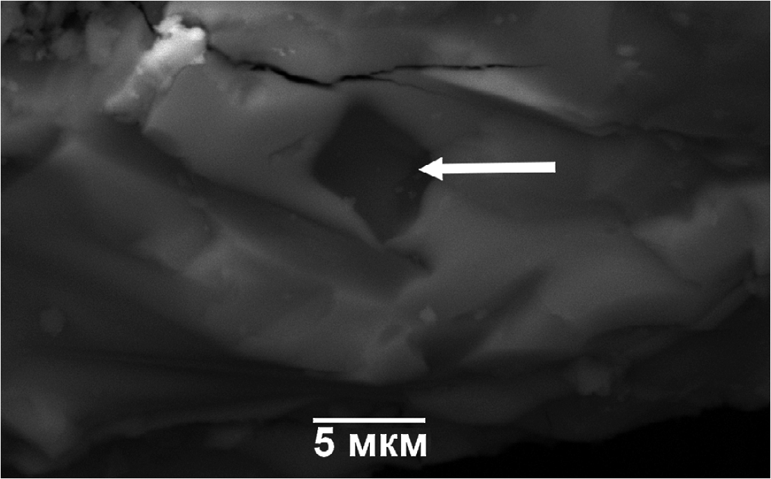 Рис. 7. Частица реголита. Стрелкой указано включение стекла тектитового состава. «Луна-16». СЭМ, отраженные электроны.