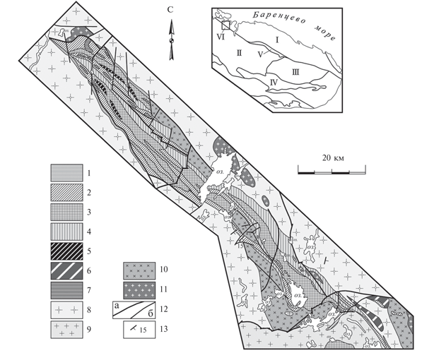 1 – лявозерская свита (биотитовые и гранат-биотитовые сланцы), 2 – полмостундровская свита, 3 – вороньетундровская свита (метабазальты, метаандезиты, метадациты), 4 – червутская свита (глиноземистые гнейсы и сланцы), 5 – габбро-амфиболиты, 6 – метагаббро-анортозиты, 7 – метаперидотиты, 8 – тоналитовые гнейсы, плагио- и плагиомикроклиновые граниты, мигматиты и гранито-гнейсы, 9 – кварцевые диориты и монцодиориты, 10 – щелочные граниты и пегматиты, 11 – микроклиновые граниты и пегматиты, 12 – разломы (а), тектонические границы (б), 13 – структурные элементы.