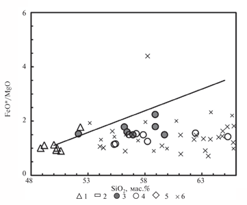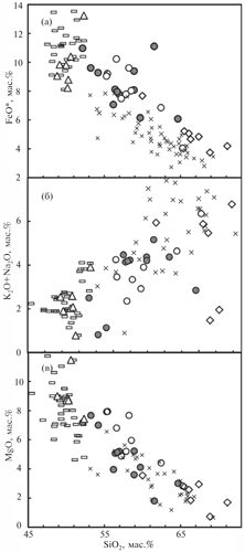 Мировая практика изучения состава и реконструкции протолита раннедокембрийских комплексов (например, Condie, 2015; Condie et al., 2016) свидетельствует, что практически все петрогенные элементы (включая щелочные) могут применяться для петрохимической классификации и идентификации раннедокембрийских пород, выявления изотопно-геохимических особенностей их протолитов при условии петрографического контроля системы опробования, что позволяет исключить из рассмотрения породы, подвергшиеся аллохимическим метасоматическим преобразованиям. При определении исходной природы метаморфических комплексов особую сложность вызывают породы среднего и кислого состава, для которых, чаще всего, возникает неопределенность при отнесении их к магматическим или осадочным образованиям. О магматической природе изученной коллекции плагиосланцев и гнейсов верхней части разреза вулканогенной толщи супракрустального комплекса ЗКП Колмозеро-Воронья свидетельствует отсутствие первичных структурно-текстурных признаков парапород и низкое значение химического индекса зрелости CIA = 100 × [Al2O3/(Al2O3 + CaO + Na2O + K2O)] (мол.%), равное 44 для средних пород и 50 – для кислых (табл. 1, 2), что характерно для неизмененных магматических пород (Nesbit, Yong, 1982). На классификационной диаграмме (Na2O + K2O)–SiO2 (Le Maitre et al., 1989) точки составов пород образуют компактную группу в поле андезибазальтов, андезитов и дацитов. По соотношению катионов Al–(Fe* + Ti)–Mg (рис. 2) (Jensen, 1976) метабазальты и метаандезиты относятся как к толеитовой, так и к известково-щелочной сериям, вне зависимости от положения метавулканитов в литологической последовательности пород. По соотношению SiO2–FeO*/MgO (рис. 3) метавулканиты кислого и среднего состава можно отнести к известково-щелочной серии (Miyshiro, 1974). Точки составов основных метавулканитов, ассоциирующих как с коматиитами, так и с андезит-дацитовыми вулканитами, на этой классификационной диаграмме располагаются вдоль условной линии разграничения пород толеитовой и известково-щелочной серий.