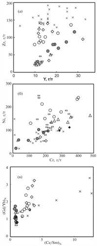 Для архейских зеленокаменных поясов (ЗКП) базальт-андезит-дацит-риолитовые (БАД) вулкано-плутонические комплексы многими исследователями принимаются в качестве главных и часто единственных «индикаторных» признаков субдукционно-аккреционных конвергентных геодинамических обстановок формирования континентальной коры гранит-зеленокаменных областей в раннем докембрии. Индикаторная роль таких комплексов, в том числе для Фенноскандинавского щита, основывается на подобии ряда их изотопно-геохимических характеристик фанерозойским адакитовым и бонинитовым вулканическим сериям (Светов, 2005; Щипанский, 2008; Бибикова и др., 2003; Martin et al., 2005) и, в частности, на содержании и соотношении высокозарядных некогерентных элементов, которые малоподвижны в водном флюиде при трансформации пород «слэба» и «мантийного клина».