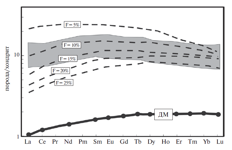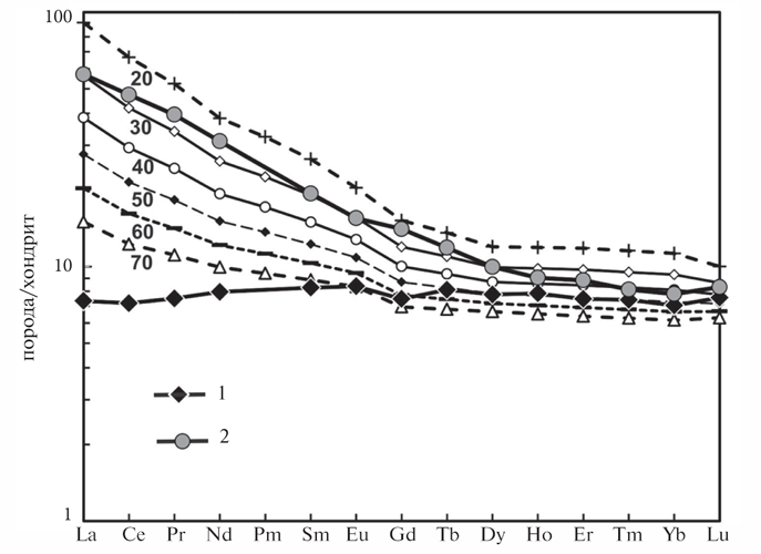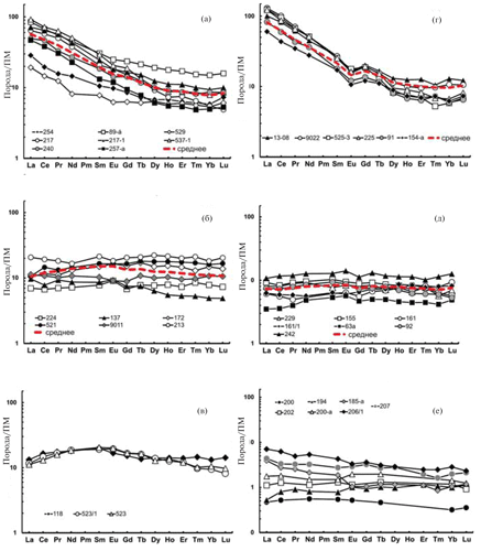 Содержания породообразующих оксидов в породах определены методом РФА по стандартной методике, концентрации редких (Li, Be, Sc, Cu, Zn, Ga, Y, Nb, Cs, Hf, Ta, Th, U) и редкоземельных элементов (РЗЭ) – методом IСP-MS в Университете Гранады (г. Гранада, Испания) и в Центральной аналитической лаборатории ВСЕГЕИ (г. Санкт-Петербург). Масс-спектроскопические измерения проводились трижды с использованием Rb, Re и In в качестве внутренних стандартов. Ошибка определения элементов Th, U, Lu, Yb, Er и Dy методом ICP-MS оценивается в 10-15%, для остальных редких земель, Ti, Zr, Sr, Y не более 5%. Содержание РЗЭ нормировалось на состав хондрита C1 (McDonough, 1995).