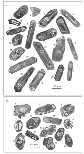 Акцессорные цирконы выделены в минералогической лаборатории Института геологии и геохронологии докембрия РАН по стандартной методике с использованием тяжелых жидкостей. U-Th-Pb датирование цирконов осуществлялось на ионном микрозонде SHRIMP-II в Центре изотопных исследований ВСЕГЕИ им. А.П. Карпинского. Измерения U-Pb отношений на SHRIMP-II проводились по методике, описанной в (Williams, 1998). Интенсивность первичного пучка ионов кислорода составляла 4 нА, а диаметр пятна (кратера) – 18 мкм. Обработка полученных данных производилась с использованием программы SQUID (Ludwig, 2000). U-Pb отношения нормализовались на значение 0.0668, приписанное стандартному циркону TEMORA (Black et al., 2003). Погрешности единичных анализов приведены на уровне 1σ, а погрешности возрастов на уровне 2σ.