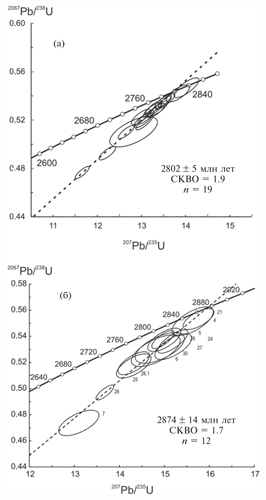 Проведенное U-Th-Pb датирование единичных зерен циркона из андезитов-1 и ранее полученные геохронологические данные для дацитов Урагубской структуры (Вревский, 2018а) позволили надежно привязать вулканизм БАД ассоциации всего УКВ ЗКП к шкале последовательности геологических событий и определить интервал времени его проявления в 2.89–2.80 млрд лет.