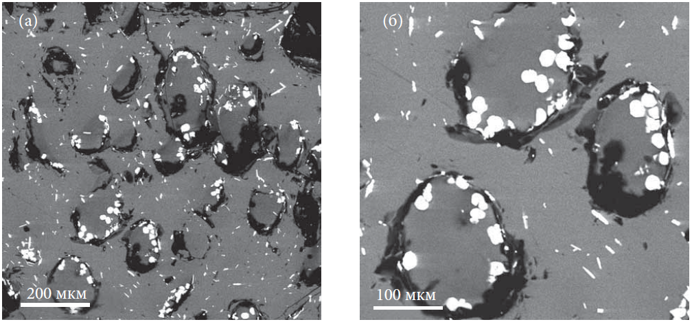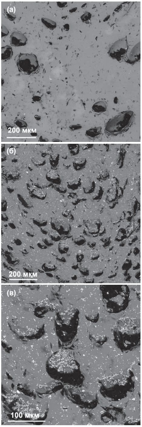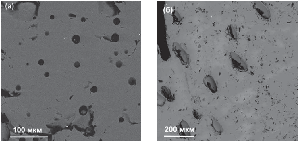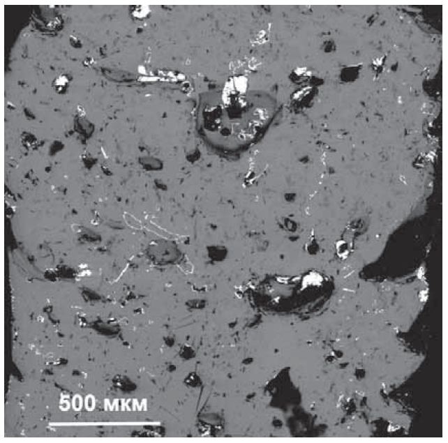 Каплевидные образования среди основной массы расплава представлены силикатным веществом (темно-серый цвет) и пустотами (черное).