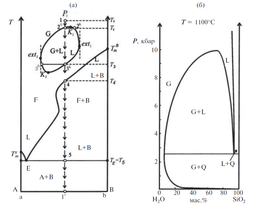 При изучении бинарных систем силикатный минерал (кварц, альбит)–вода выяснилось, что для них присущи фазовые равновесия, свойственные для систем P–Q типа, осложненных расслаиванием жидкости. Характерно наличие двух – нижней и верхней – областей флюидной несмесимости, причем в верхней области сосуществуют две жидкости, в нижней – пар и жидкость. Кроме того, в определенном интервале Р-Т-Х условий возможно расслаивание жидкой фазы, т.е. появляется еще одно поле несмесимости. При увеличении числа компонентов в таких системах сосуществование несмесимых жидких фаз может иметь стабильный или сохранять метастабильный характер.