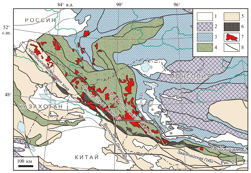 В строении Центрально-Азиатского складчатого пояса структурами первого порядка являются поздненеопротерозойские–раннепалеозойские (каледонские) и средне–позднепалеозойские (герцинские) складчатые области. Первые охватывают ближнее складчатое обрамление Сибирской платформы, включающее большую часть Алтае-Саянской области, Северную Монголию, в том числе структуры Китайского, Монгольского и Гобийского Алтая и Западное Забайкалье. Область средне–позднепалеозойских структур обрамляет их с юга и юго-запада, прослеживаясь через Северо-Восточный Казахстан, Северную Джунгарию и Южную Монголию (рис. 1). Граница этих тектонических структур вдоль южных склонов Монгольского Алтая трассируется выходами высокоградных метаморфических пород. Аналогичные выходы фиксируются и западнее, на границе южной части Китайского Алтая и Северной Джунгарии и далее вдоль Иртышской сдвиговой зоны (рис. 1). Общая протяженность цепи выходов глубокометаморфизованных пород, объединяемых в Южно-Алтайский метаморфичеcкий пояс (ЮАМП) (Козаков и др., 2011), достигает около 1500 км.