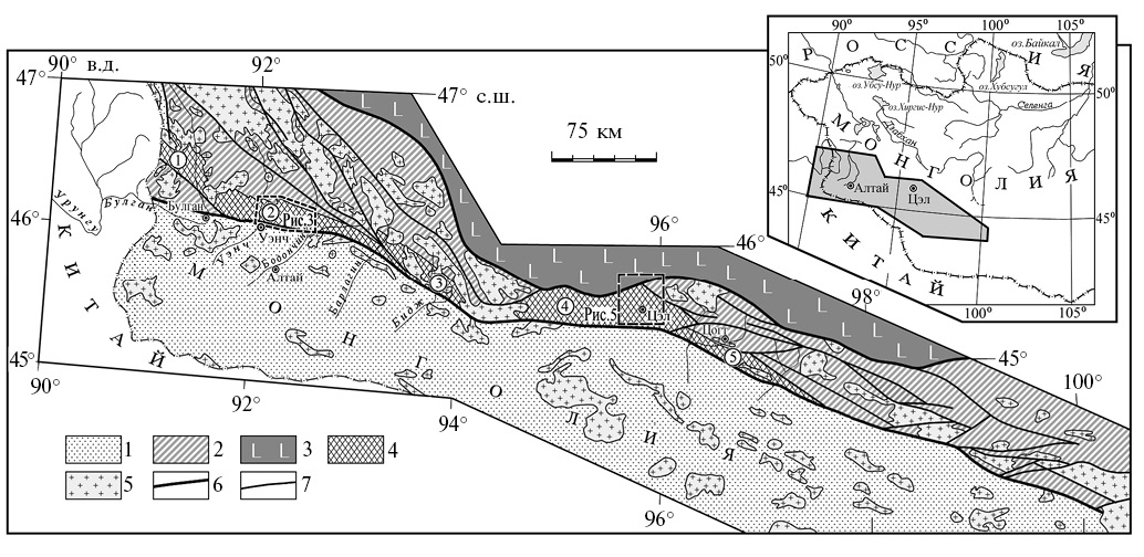 Рис. 2. Схема геологического положения тектонических пластин кристаллических пород монгольского сегмента Южно-Алтайского метаморфического пояса (Козаков и др., 2007, с изменениями). 1 – среднепалеозойские комплексы энсиматической островной дуги Заалтайской Гоби; 2 – ранне–среднепалеозойские вулканогенно-терригенные комплексы Алтайского аккреционного клина; 3 – поздненеопротерозойские–раннепалеозойские комплексы ювенильной коры Озерной зоны; 4 – тектонические пластины высокоградных метаморфических пород Южно-Алтайского пояса (цифры в кружках 1 – Булганская, 2 – Бодончинская, 3 – Барлагинская, 4 – Цэлская, 5 – Цогтская); 5 – средне–позднепалеозойские гранитоиды; 6 – глубинные разломы, разделяющие основные тектонические структуры; 7 – разломы