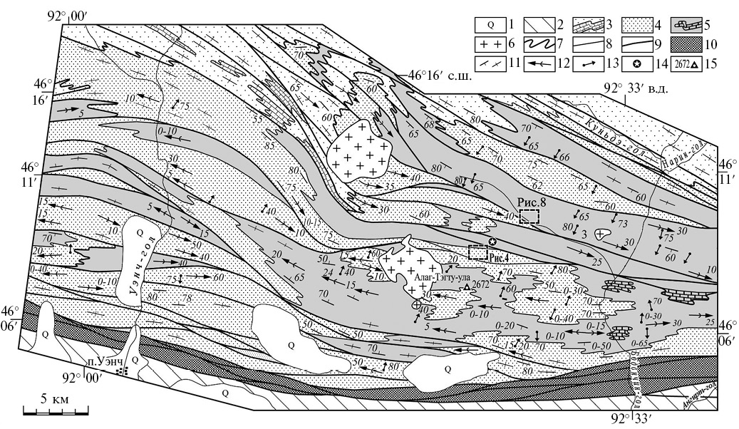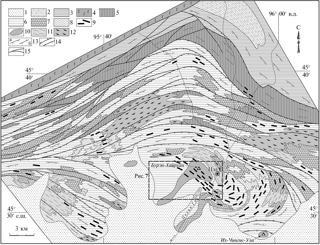 Рис. 5. Схема строения восточной части Цэлской тектонической пластины. 1 – рыхлые отложения; 2 – позднепалеозойские песчаники, аргиллиты, известняки; 3 – раннепалеозойские слабо и неметаморфизованные вулканогенно-терригенные отложения; 4 – поздненеопротерозойские–раннепалеозойские вулканиты основного состава Озерной зоны; 5–14 – цэлский кристаллический комплекс: 5 – монометаморфические биотитовые, биотит-хлоритовые, гранат-биотитовые, амфиболовые гнейсы; 6–8 – полиметаморфические породы: 6 – биотитовые, двуслюдяные и гранат-биотитовые гнейсы; 7 – толща переслаивания биотитовых гнейсов и мраморов, 8 – толща переслаивания мигматизированных амфиболитов и гнейсов; 9–11 – магматические породы, вовлеченные только в метаморфизм М2: 9, 10 – метабазиты гашуннурского комплекса: 9 – дайки, 10 – массивы и 11 – гнейсо-граниты, гнейсо-диориты и трондьемиты; 12 – гнейсовидные гранодиориты, трондьемиты, вовлеченные в метаморфизм М1; 13 – кристаллизационная сланцеватость, связанная с метаморфизмом М2 (а – наклонная, б – вертикальная); 14 – зоны рассланцевания, сдвиговые зоны, связанные с метаморфизмом М2; 15 – разломы.