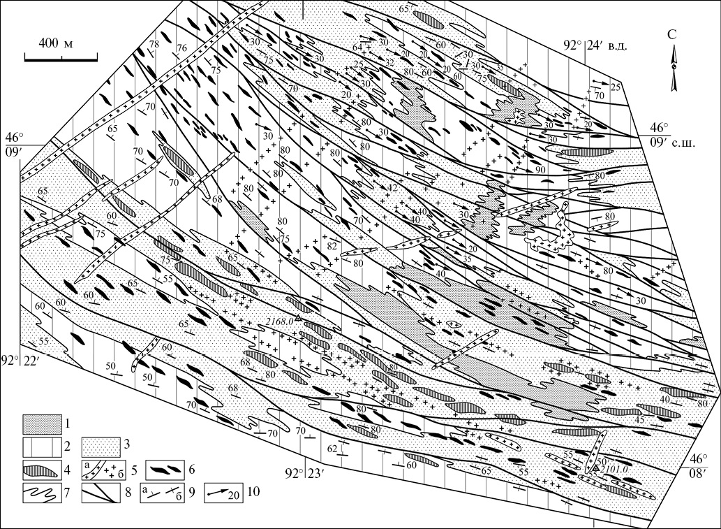 Рис. 4. Геологическая схема центральной части Бодончинской тектонической пластины. 1–3 – полиметаморфические породы: 1 – гранат-биотитовые гнейсы, 2 – биотитовые гнейсы, 3 – толща пeреслаивания биотитовых и гранат-биотитовых гнейсов с гранат-пироксеновыми сланцами, кальцифирами и амфиболитами; 4 – зоны Fe-Mg метасоматитов, связанных с метаморфизмом M2; 5 – жильные тела (а) и поля (б) гранатовых гранитов и пегматитов; 6 – рои даек гашуннурского комплекса; 7 – деформированные тектонические границы; 8 – сдвиговые зоны, разломы; 9 – кристаллизационная сланцеватость (а – наклонная, б – вертикальная); 10 – ориентировка шарниров складок, сопряженных с метаморфизмом М2.