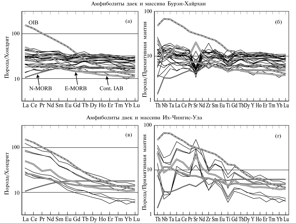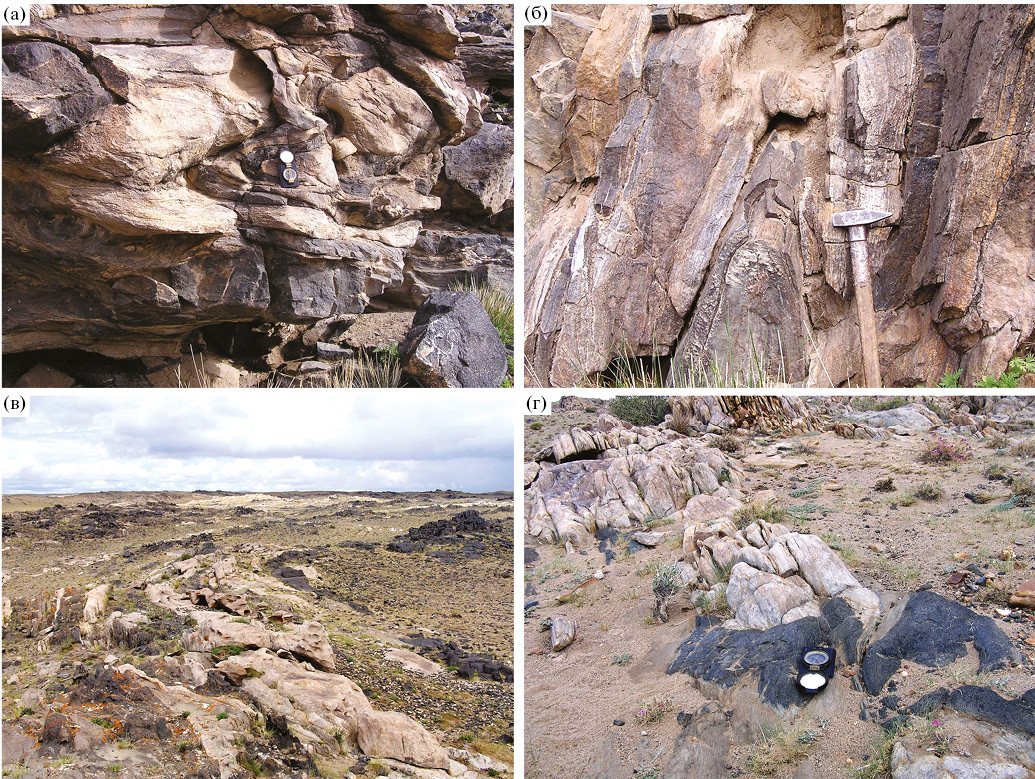 Характерными образованиями тектонических пластин ЮАМП являются метабазиты гашуннурского комплекса, образующие как отдельные дайковые тела и массивы (Бурэн-Хайрхан, Их-Чингис-Ула), так и рои даек (рис. 4–7). Их внедрение происходило в интервале между эпизодами метаморфизма андалузит-силлиманитовой М1 и кианит-силлиманитовой М2 фациальных серий. В полиметаморфичеких породах они имеют секущие контакты со структурами раннего эпизода М1 и превращены в амфиболиты и/или гранатовые амфиболиты при метаморфизме М2 (рис. 6а, 6в, 6г). В них развиты ранние пологие и субвертикальные структуры, связанные с метаморфизмом М2. В Цэлской пластине они прорывают гнейсо-граниты и ультраметагенные жильные граниты, завершающие метаморфизм М1, и совместно с ними переработаны в процессе метаморфизма М2. В монометаморфических породах дайки гашуннурского комплекса представляют собой типичные дометаморфические образования, слагающие, как правило, пластовые тела, согласные со сланцеватостью, которые рассматривались в составе разреза метаморфического комплекса как метавулканиты (Маркова, Федорова, 1971).