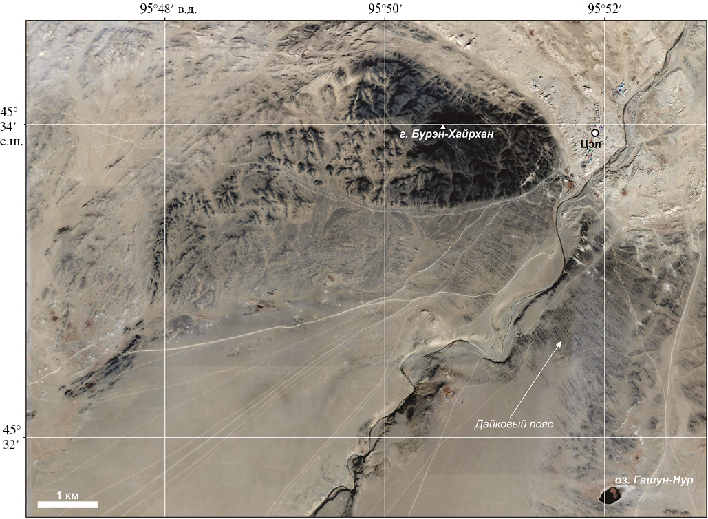 Рис. 7. Космический снимок юго-восточной части Цэлской тектонической пластины с массивом метабазитов Бурэн-Хайрхан и гашуннурского дайкового роя.